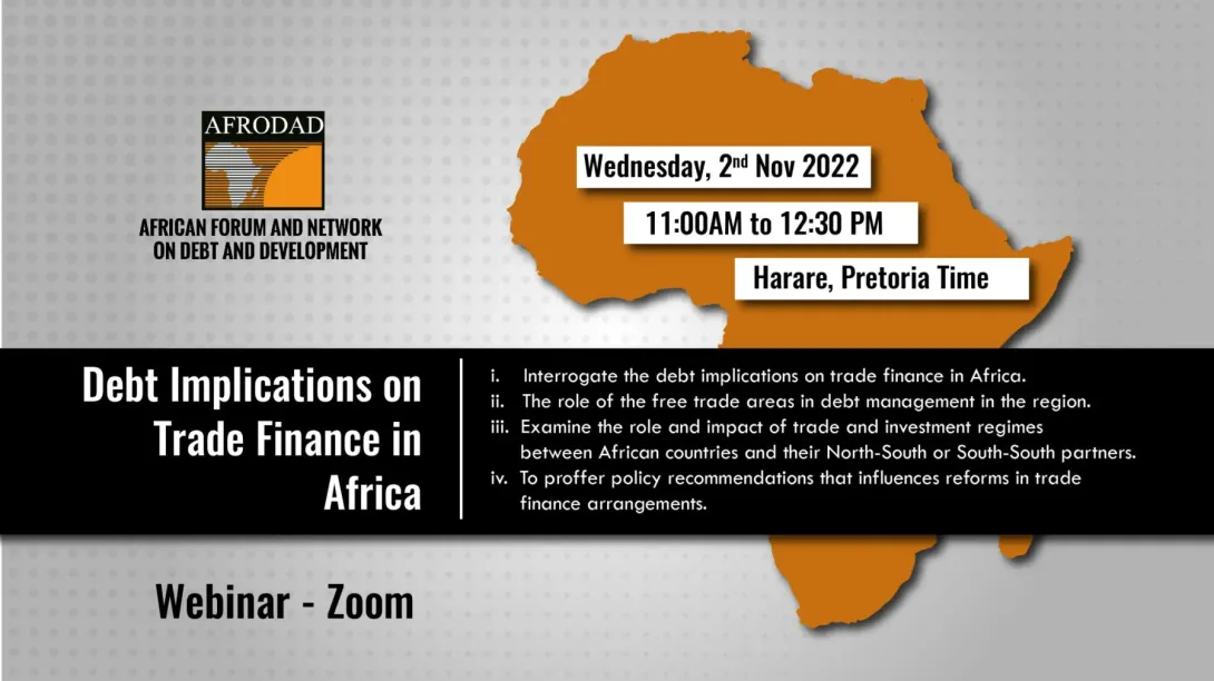 AFRODAD is hosting a webinar to discuss and validate a briefing paper titled “Debt Implications on Trade Finance in Africa”. The meeting will aim at discussing the findings of the briefing paper on assessing the impacts of debt on trade finance in Africa”. The purpose is to strengthen the evidence base and deepen understanding on the economic, social and political policy impacts of debt on trade finance in the region. This will help in increasing awareness and influence reform on sustainability and suitability of trade finance mechanisms that African countries ought to adopt for the recovery.