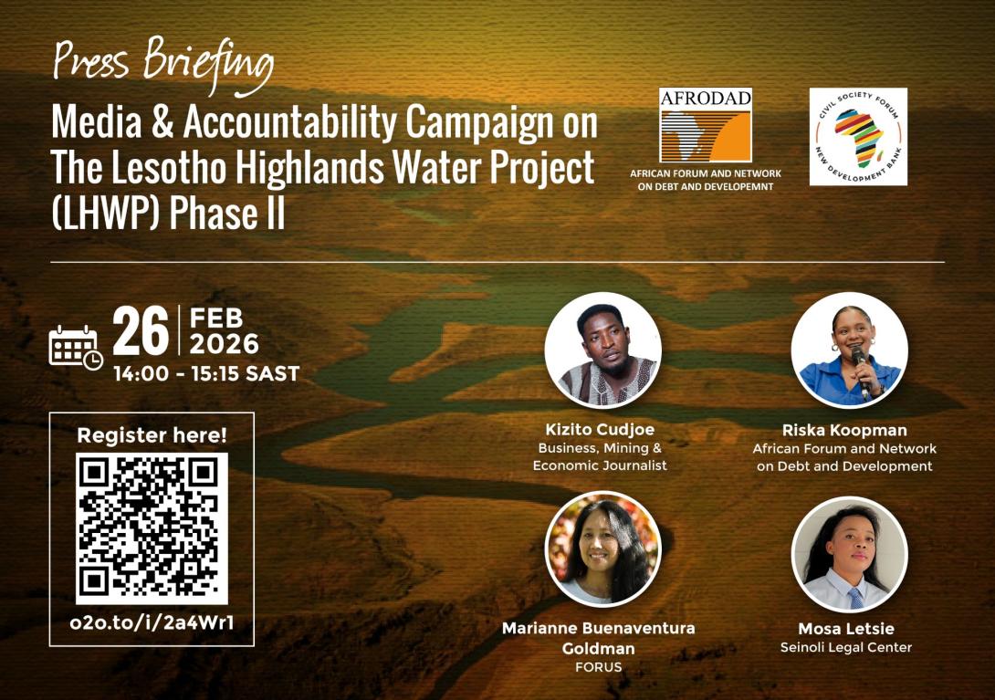 The African Forum and Network on Debt and Development and the Civil Society Forum on the New Development Bank (CSF‑NDB) is convening a press briefing as part of a Media & Accountability Campaign on the Lesotho Highlands Water Project (LHWP) Phase II, with a focus on the Polihali Dam and associated infrastructure.